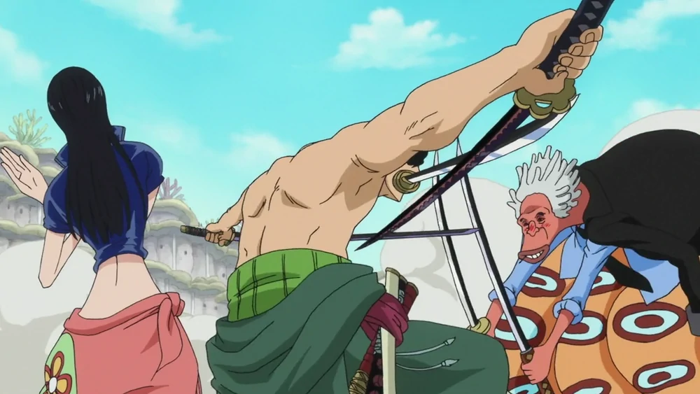 Zoro était le seul de l’équipe à ne pas faire confiance à Robin après l’Arc d’Alabasta (il était le seul membre qu’elle ne pouvait pas vraiment soudoyer ou « charmer »). Plus tard, il démontre sa volonté de la défendre lorsqu’elle était en danger. Lui, par exemple, l’a appréhendée alors qu’elle était sur le point d’être tuée par Ener et a été le premier à se précipiter vers son soutien quand Aokiji l’a confrontée.